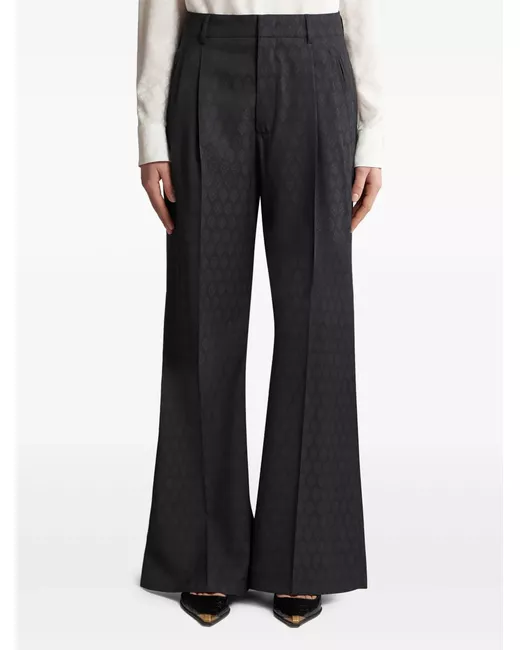 black wool patterned jacquard pleat detailing pressed crease belt loops concealed front fastening two side jetted pockets two rear welt pockets wide leg