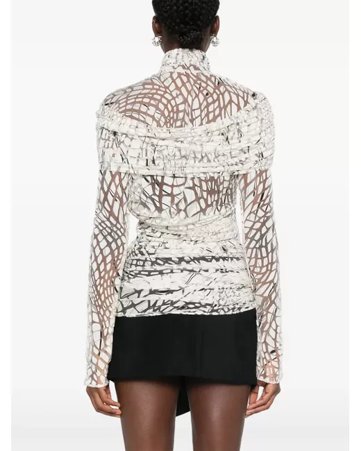 white/black/beige abstract pattern print semi-sheer construction layered details ruched detailing draped detailing mock neck long sleeves concealed side zip fastening