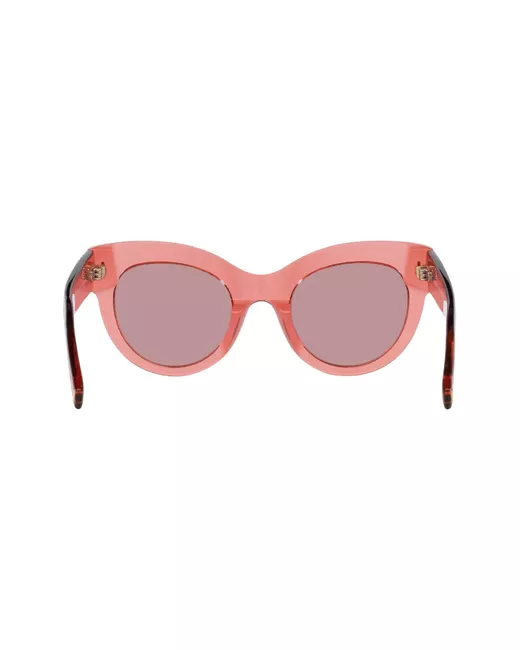 deep pink acetate translucent design logo plaque at the arm gold-tone hardware round frame straight arms pink tinted lenses