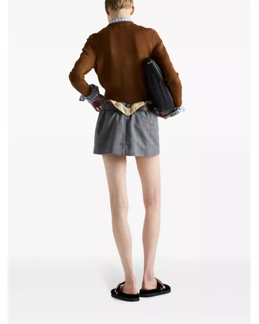 grey wool twill weave pinstripe print mid-rise belt loops pleat detailing decorative button detailing concealed front fastening detachable and adjustable waist belt two side welt pockets rear button-fastening jetted pocket thigh-length straight hem
