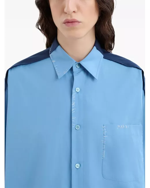 blue cotton panelled design two-tone design decorative stitching embroidered logo at the chest front patch pocket classic collar front button fastening long sleeves buttoned cuffs curved hem