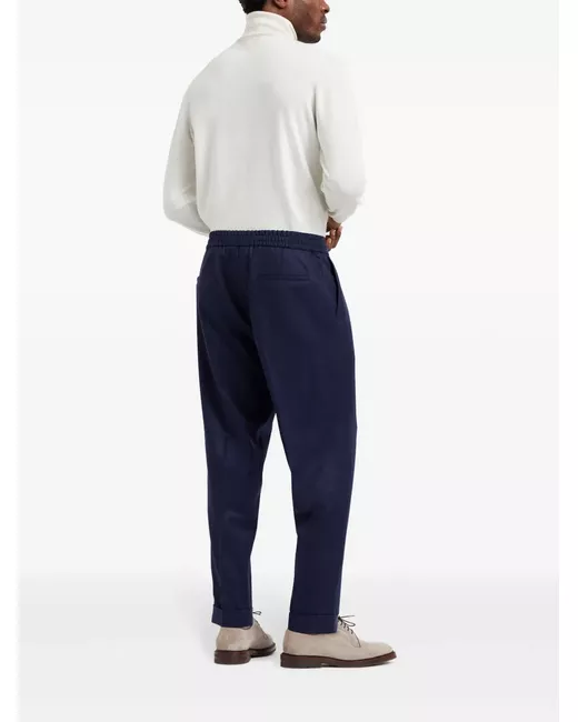 navy blue virgin wool pleat detailing elasticated drawstring waistband tapered leg two side inset pockets two rear welt pockets rolled cuffs