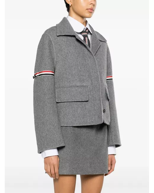 medium grey boiled wool-cashmere blend brushed effect grosgrain ribbon trim signature grosgrain loop tab spread collar concealed front fastening bell sleeves two front flap pockets straight hem