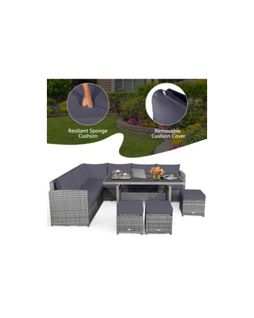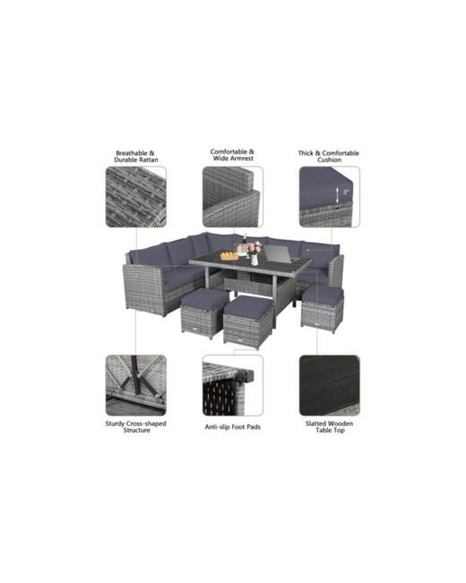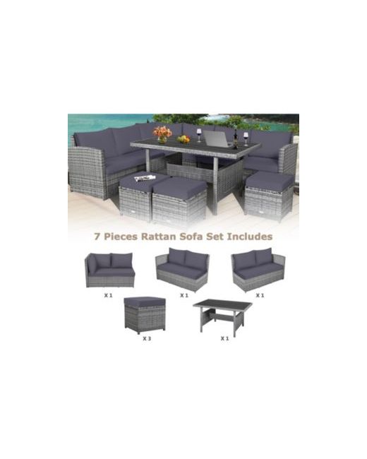 This 7-piece patio rattan sectional sofa set is made of steel construction and all-weather Pe wicker,it includes 3 corner chairs,1 table,and 3 ottomans.The lofty sponge padded cushions provide great comfort,while the matching dining table with a wooden top is ideal for holding drinks and food.