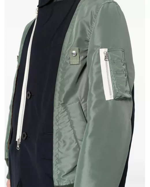navy/military green textured finish stand-up collar long sleeves sleeve zip pocket button cuffs two side welt pockets contrasting panel detail English rear vents off-centre front zip fastening full lining