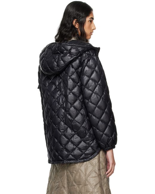 DIST-certified down-filled quilted nylon satin jacket. · Drawstring at hood · Stand collar · Two-way zip closure · Press-stud welt pockets · Curved hem · Flap pocket and felted logo patch at sleeve · Elasticized cuffs · Fully lined Supplier color: Black Fill: 90% goose down, 10% feather.