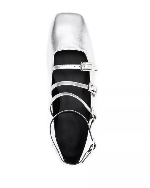 silver-tone calf leather metallic finish three front buckle-fastening straps buckle-fastening ankle strap square toe branded leather insole flat leather sole low stacked heel with rubber grip