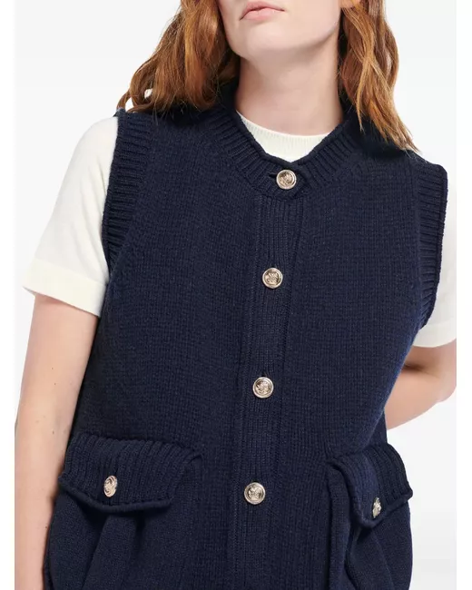 navy blue cashmere chunky knit crew neck front button fastening sleeveless two front flap pockets ribbed trim straight hem