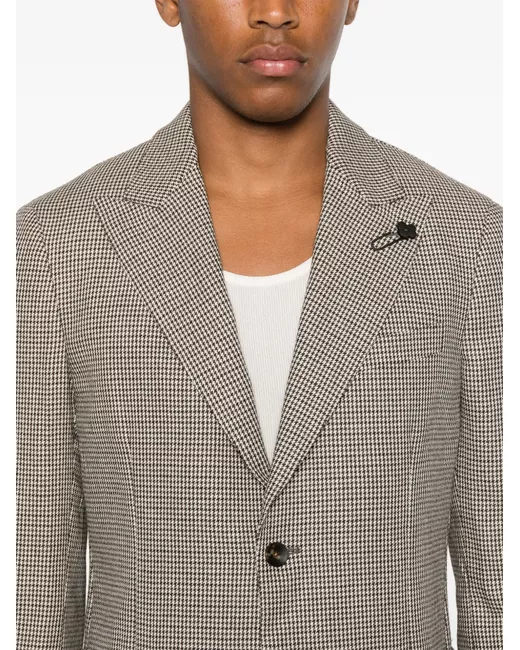 houndstooth pattern peak lapels long sleeves faux-buttoned cuffs chest welt pocket two side patch pockets English rear vents straight hem front button fastening
