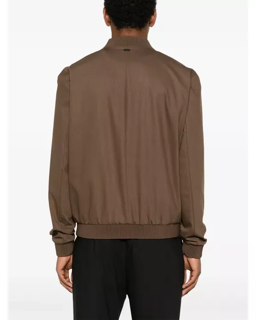 coffee brown baseball collar two front welt pockets long sleeves ribbed cuffs and hem contrast lining front zip fastening