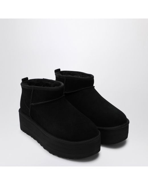 Black suede low boot from UGG featuring sheepskin and suede upper, round toe, back puller, sheepskin insole and 5.1 cm platform sole.