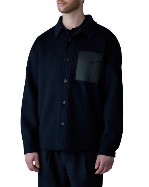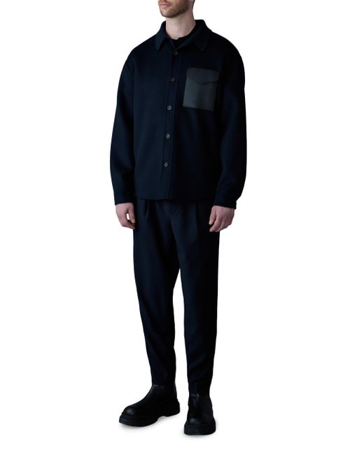 Mackage's Emmanuel double-face wool overshirt features a convertible spread collar, leather flap pocket, and button-front closure. This luxurious style is cut for a relaxed fit. Spread collar Long sleeves, barrel cuffs Chest flap pocket Side slip pocket Button-front closure 100% wool Combo: 60% leather/40% polyurethane Dry clean by leather specialist Imported SIZE & FIT This style is designed for a relaxed fit About 31.5" from shoulder to hem Model measurements: 6'2" tall, 40" chest, 31" waist Model is wearing a US size 40 ABOUT THE BRAND Founded in Montreal in 1999, Mackage began as a comprehensive outerwear brand offering everything from fine leather jackets to tailored wool coats and down parkas. The label evolved to develop superior construction and comfort, creating flattering and elegant silhouettes. Mackage is committed to quality and performance with an eye toward aesthetic innovation in its women's, men's and kids' designs. Mens Modern Coll & Outer - Contemporary Outerwear > Mackage > Saks Fifth Avenue > Barneys. Mackage. Color: Navy. Size: 46.