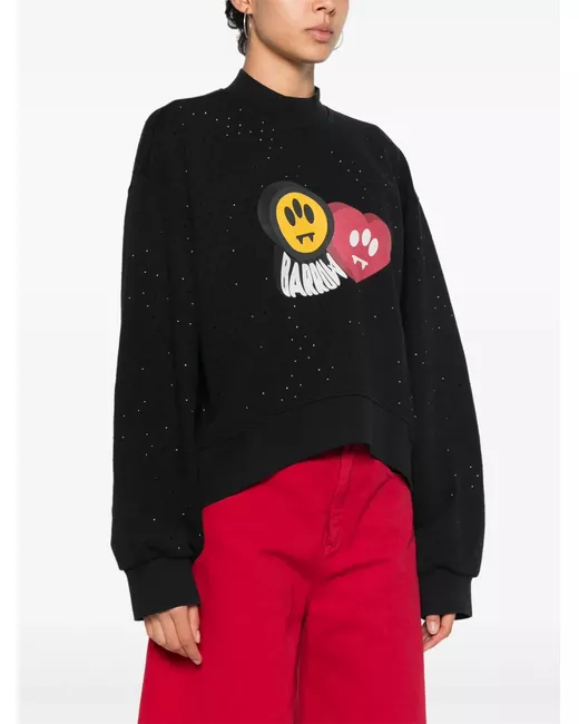 black cotton jersey texture logo print to the front rhinestone embellishment crew neck drop shoulder long sleeves ribbed cuffs and hem straight hem French terry lining
