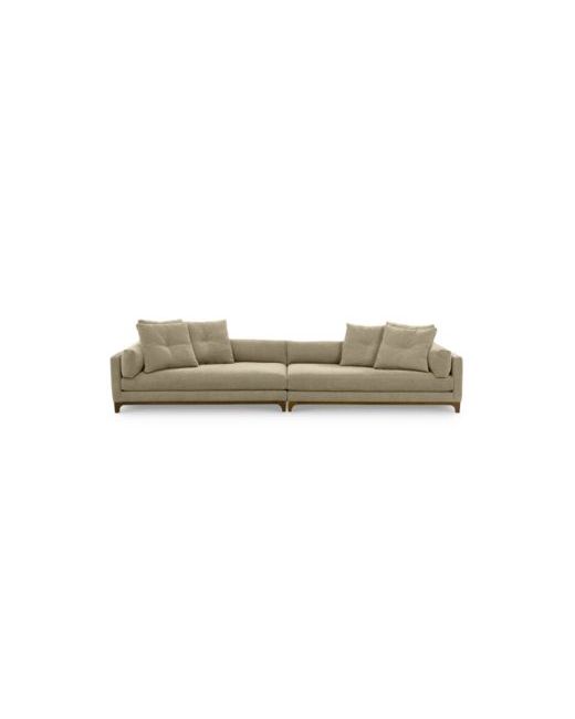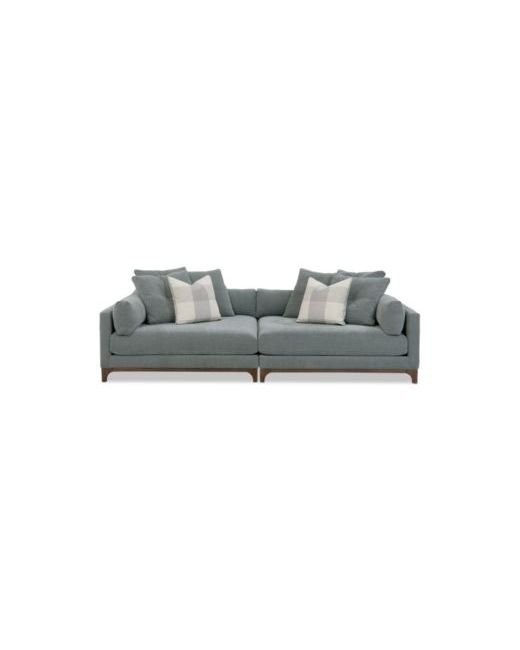 Get ready to cuddle, kick back or take a nap on this chic and comfortable two-piece sofa sectional set. Deep-seated low profile bolsters back layered with another set of loose pillows will make it hard to leave this stunner. Style is not sacrificed in the slick contemporary design, with its clean lines and track arms all supported by an exquisite open bottom walnut frame and legs.
