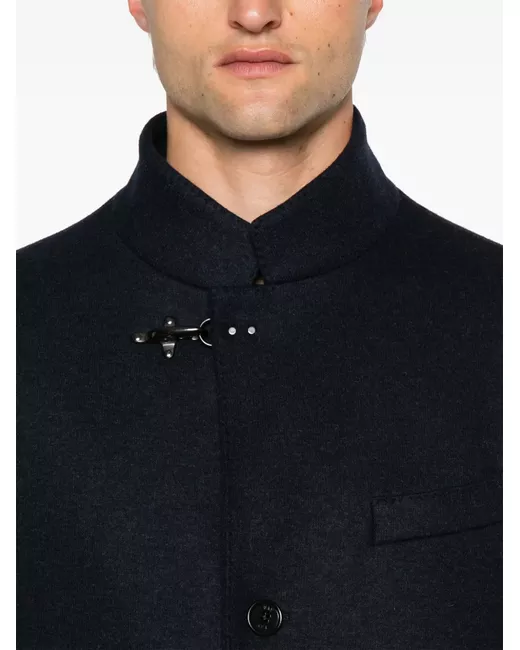 midnight blue wool blend non-brushed fleece high neck lobster claw fastening front button fastening long sleeves buttoned cuffs chest welt pocket two front flap pockets central rear vent straight hem above-knee length partial lining