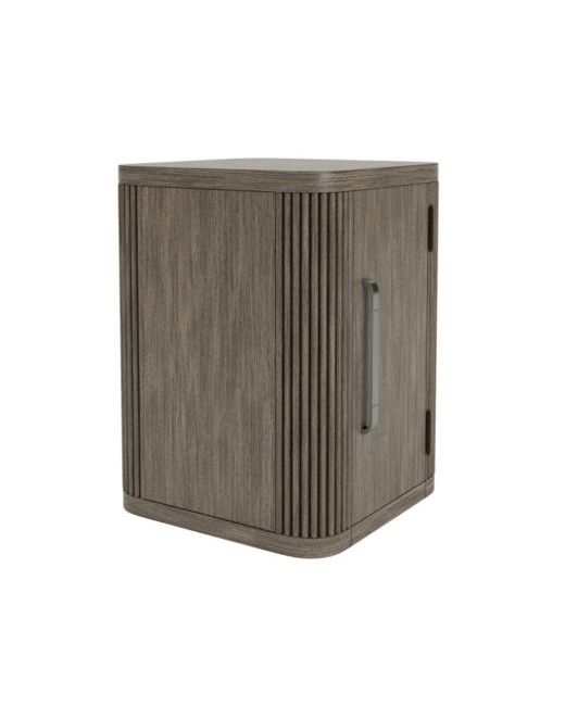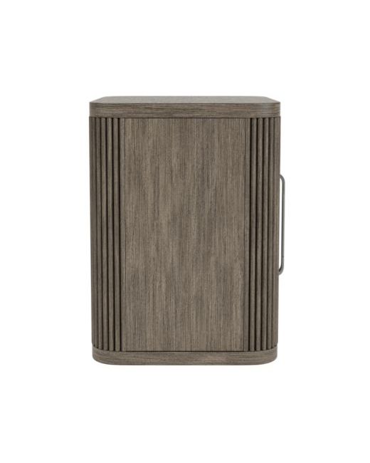 Redefining modern furniture, the Frandlyn Chairside Table boasts soft rounded edges, reeded accents, and a Designer Espresso finish. The functional door in the front has two shelves inside which offer storage space for small spaces. The custom-designed, two-toned metallic bar pulls add a touch of elegance. Seamlessly blending contemporary style with timeless sophistication, this piece elevates any space it adorns.