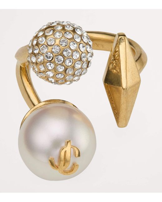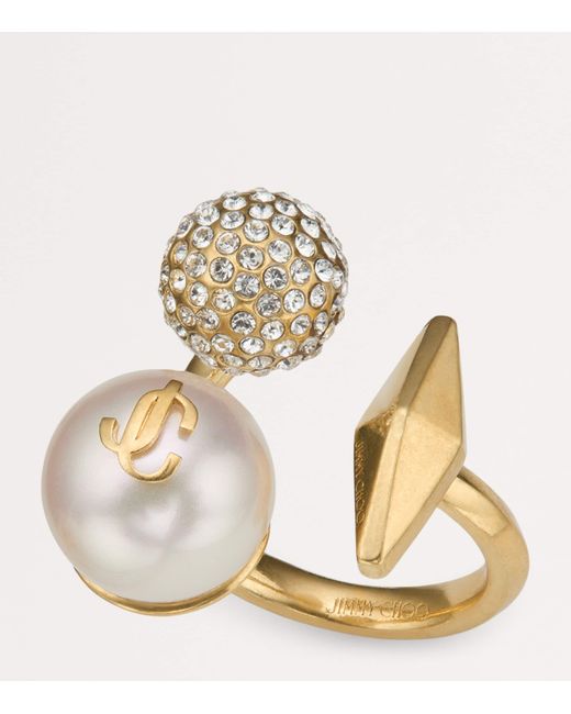 This season, Jimmy Choo spotlights the juxtaposition of its most noticeable motifs: the Diamond, the pearl and the sparkle. For the Multi Charm ring, the angular, geometric design sits opposite two balls - one a pearlescent orb featuring the interlinked JC monogram, the other a metal sphere ornately studded with crystals. Both balance with grace at each end of the gold-tone band for a piece that deserves an appearance at your next evening event.