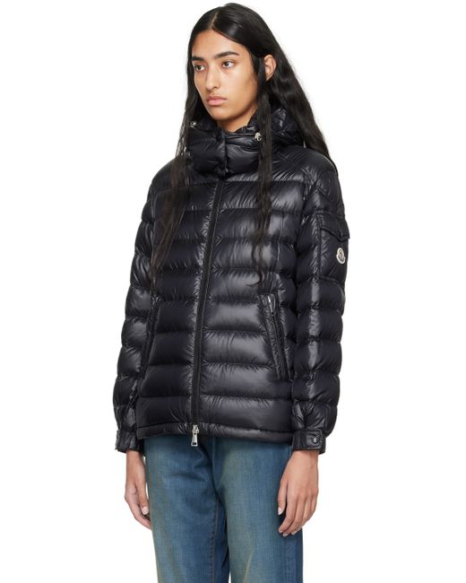 Down-filled quilted recycled nylon satin jacket. · Bungee-style drawstring and press-stud fastening at detachable hood · Stand collar · Two-way zip closure · Zip pockets · Concealed bungee-style drawstring at hem · Patch pocket and tricolor felted logo patch at sleeve · Press-stud fastening at elasticized cuffs · Full recycled nylon satin lining Supplier color: Black Fill: 90% goose down, 10% feather.