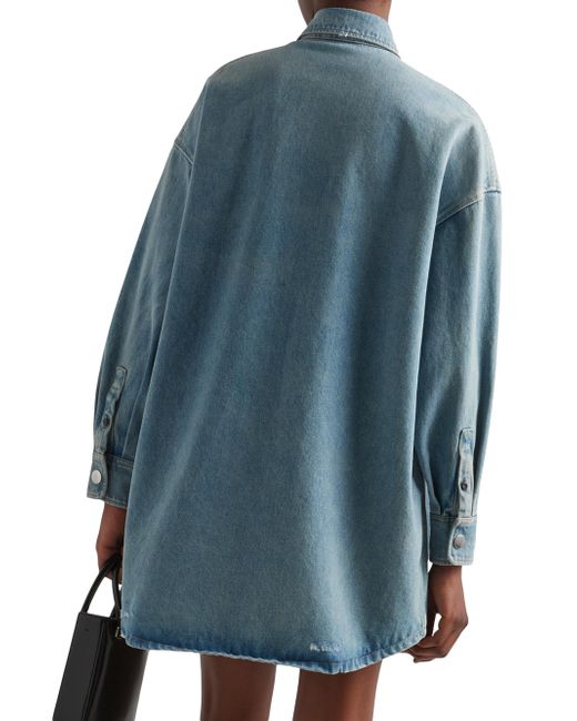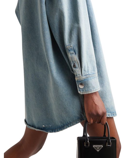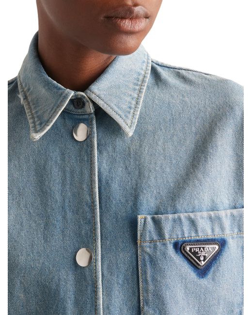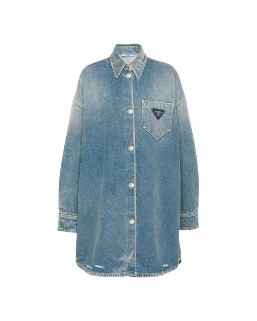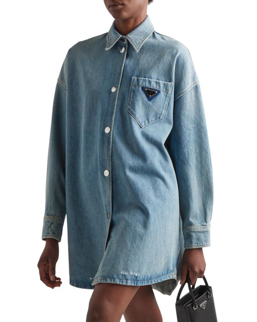 References to streetwear define this oversized shirt made of denim with a washed effect that adds a vintage inspired feel. Contrasting stitching outlines the silhouette, accented with a patch pocket featuring the iconic enameled triangle logo. Oversized fit Washed denim Unlined Shirt collar Long sleeves Patch pocket Contrasting stitching Enameled metal triangle logo Center-back length: 88 cm Size: 38 Imported 100% cotton. Lsd Rtw - Prada Rtw > Prada > Saks Fifth Avenue > Barneys. Prada. Color: Blue. Size: 0.