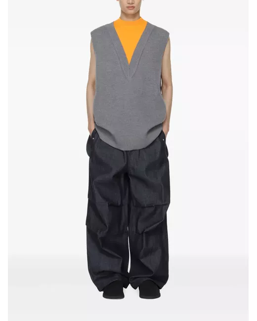 grey cotton denim elasticated waistband two side button-fastening pockets two rear flap pockets wide leg