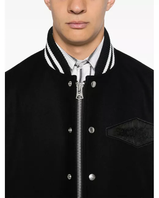 black wool/calf leather panelled design front two-way zip fastening front press-stud fastening striped ribbed band collar contrasting-fabric sleeves long sleeves logo patch at the chest two side welt pockets press stud-fastening side vents embroidered motif to the back internal slip pocket full lining striped ribbed cuffs and hem