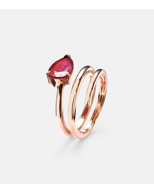 Material: 18kt rose gold. Made in the USA. Stone I: ruby, pear-shaped. Stone I carat weight (ct): 1.5-2.0. Pinky ring.