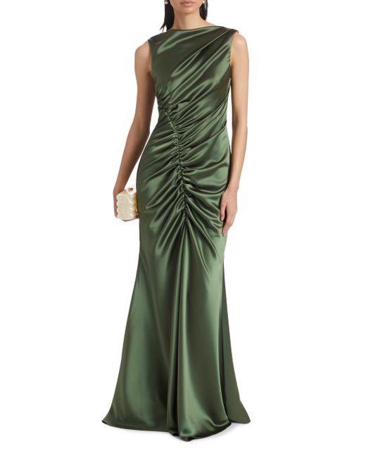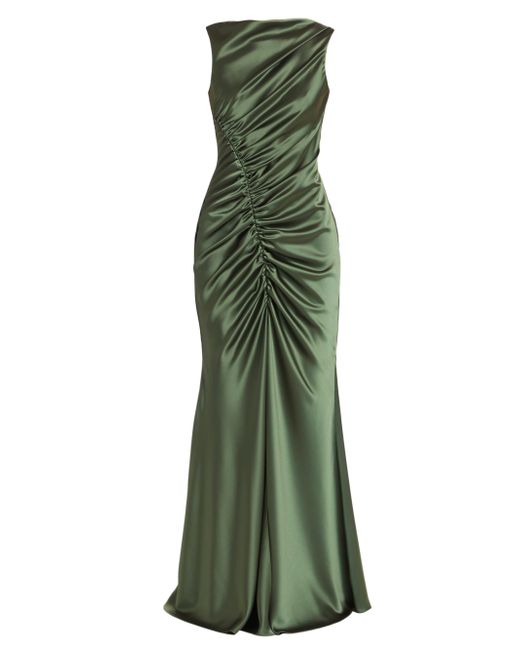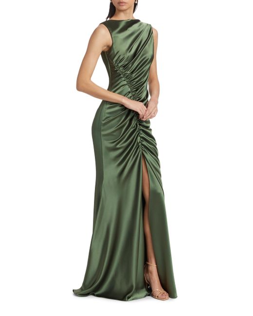 This Amsale satin sleeveless gown is styled with a ruched design and features a side slit. A circle-cut skirt adds flair to this look. Bateau neck Sleeveless Back zip closure 100% polyester Dry clean Imported SIZE & FIT About 61.5" from shoulder to hem Model measurements: 5'10" tall Model is wearing a US size 4 Please Note: This item runs small. Dress Collections - Modern Evening > Amsale > Saks Fifth Avenue > Barneys. Amsale. Color: Olive. Size: 0.