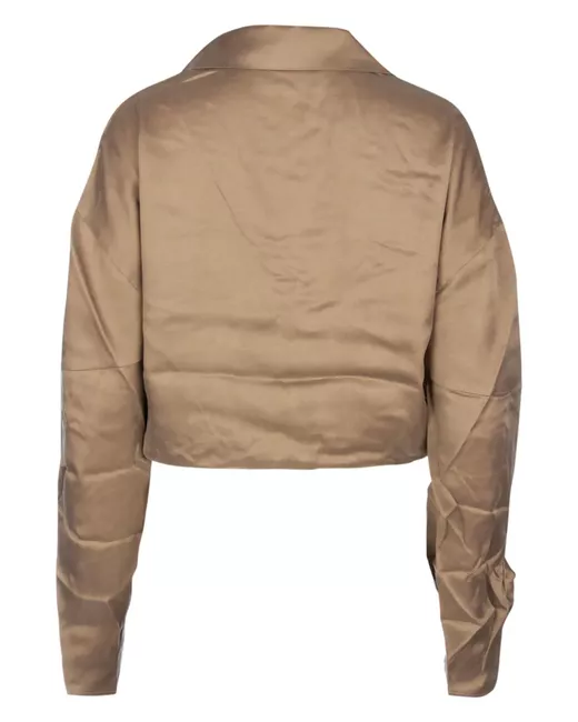 taupe brown cotton satin weave drawstring fastening spread collar V-neck drop shoulder long sleeves straight hem cropped