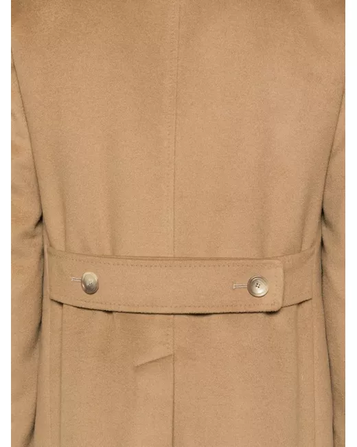 beige virgin wool felted finish concealed front button fastening notched collar long sleeves belted cuffs chest welt pocket two front welt pockets adjustable strap to the rear central rear vent quilted lining straight hem