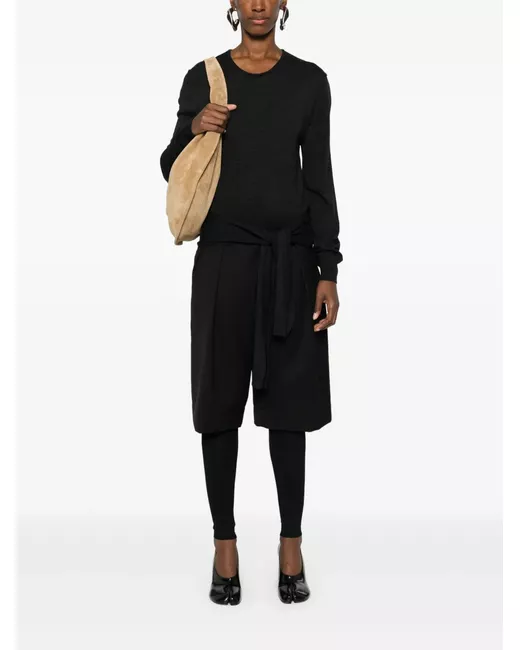 anthracite grey wool blend fine knit crew neck asymmetric design long sleeves exposed-seam detailing ribbed cuffs and hem side slits tied waist high-low hem