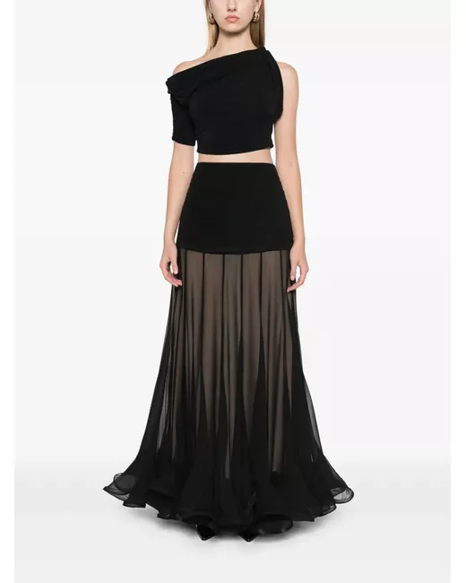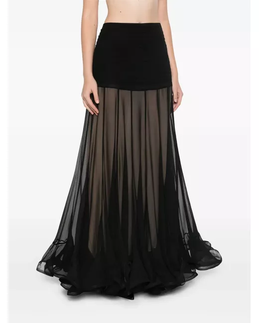 black silk sheer pleated waist concealed rear zip fastening fitted waistline French seams crinoline hem long length