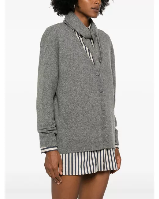 medium grey merino wool blend ribbed knit mélange effect front button fastening V-neck drop shoulder long sleeves ribbed cuffs and hem draped panel detail straight hem