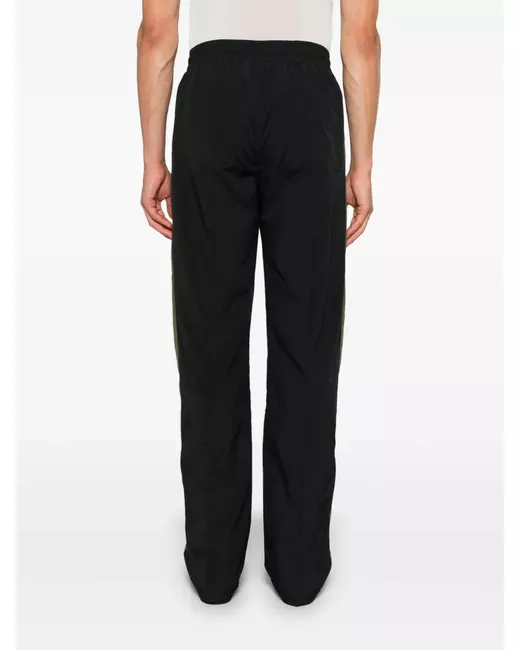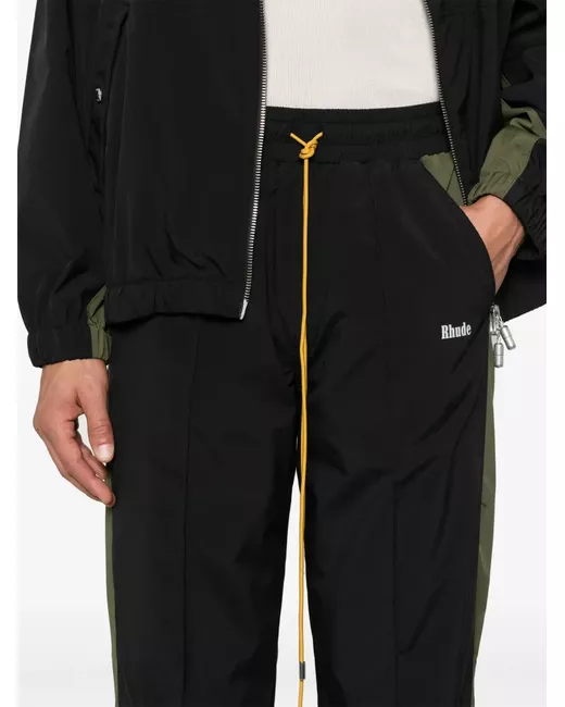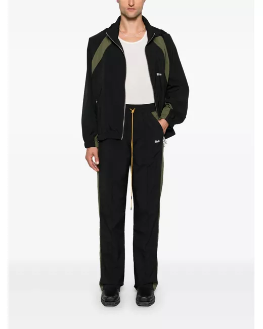 black/olive green colour-block panelled design elasticated drawstring waistband pintuck detailing two diagonal pockets to the sides two rear patch pockets logo print to the front