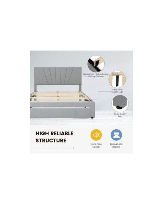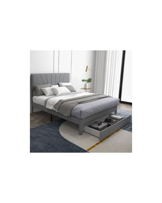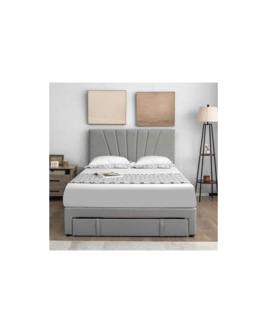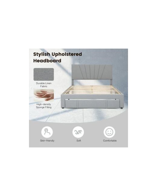 Our upholstered bed frame built with solid wooden slats and extra support legs. It includes a pull-out drawer and extensive under-bed space for easy storage of personal items. The adjustable headboard, filled with soft sponge and covered in durable linen, provides tailored comfort.