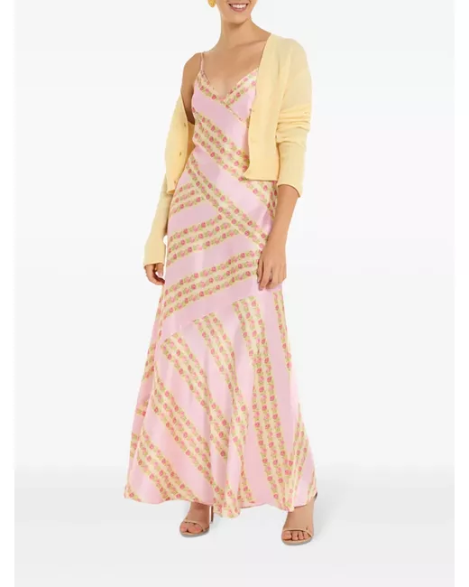 pink silk satin finish floral print wrap design adjustable spaghetti straps flared skirt straight hem floor-length