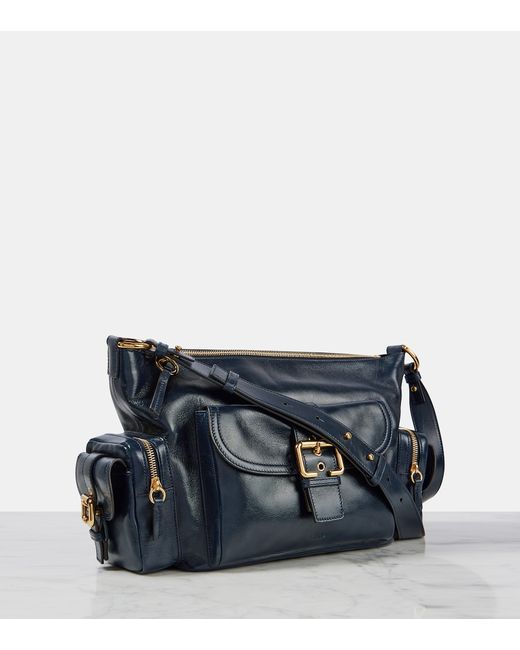 Material: leather. Lining: fabric. Made in Italy. Designer color name: Evening Blue. Top handle, Adjustable shoulder strap. Front pockets. Zipped side pocket. Internal details: internal slot pocket. Closure: zipped top. Includes: dust bag.