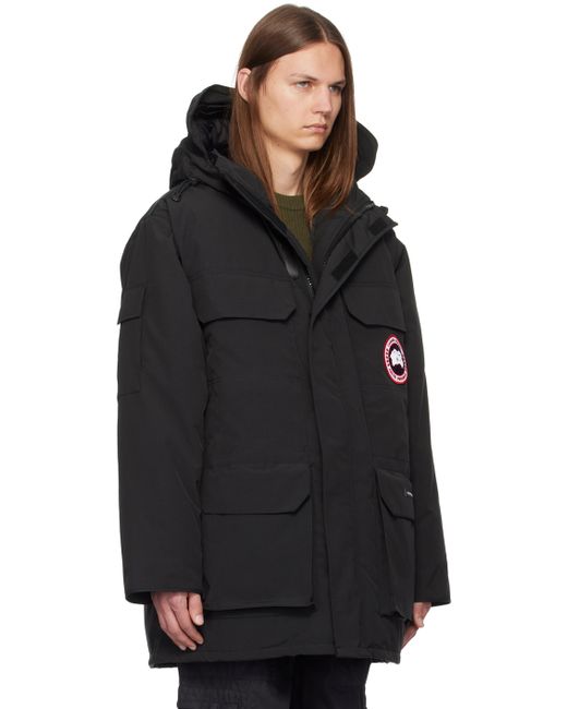 Oversized RDS-certified down-filled Arctic Tech® polyester- and cotton-blend duck canvas jacket. Water-repellent and durable. · Detachable brim at hood · Bungee-style drawstring at hood and interior waist · Funnel neck · Two-way zip closure with velcro placket · Flap and zip pockets · Logo patches at front · Flap pocket at sleeve · Pen slots at sleeve · Inset rib knit cuffs · Webbing strap with logo patch at back collar · Zip and patch pockets at interior · Elasticized shoulder straps at interior · Snow skirt with elasticized hem at interior · Full satin lining Supplier color: Black Fill: 80% duck down, 20% duck feather.
