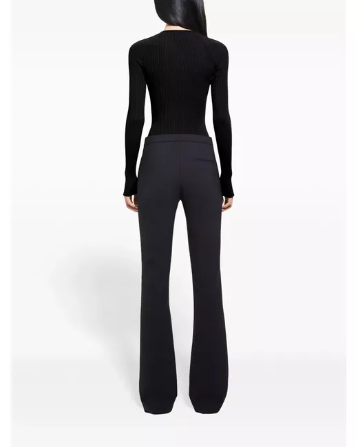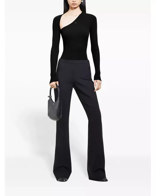 black ribbed knit embroidered logo to the front asymmetric neck long sleeves straight hem