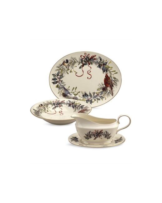 The classic Lenox Winter Greetings Collection features winter birds perched amidst a motif of pinecone, holly and mistletoe. Crafted from durable bone china with 24-karat gold accents, this dinner plate makes an artful addition to the holiday tabletop. Made in the U.s.a.