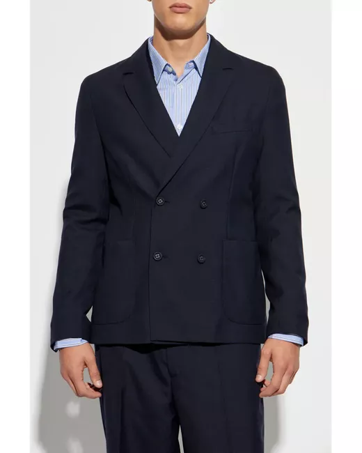 navy blue virgin wool double-breasted button fastening notched lapels two side patch pockets long sleeves straight hem