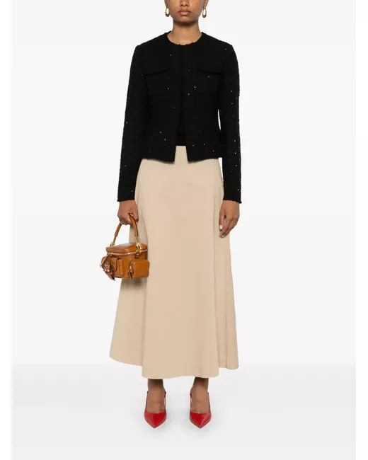 black tweed crystal embellishment front hook and eye fastening collarless long sleeves chest flap pockets satin lining straight hem cropped