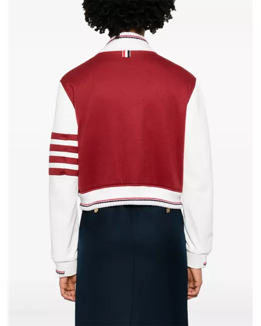 burgundy/white cashmere/lambskin panelled design ribbed stripe trim ribbed band collar front press-stud fastening with logo studs long sleeves with signature 4-Bar stripe two front welt pockets internal slip pocket straight hem RWB stripe lining