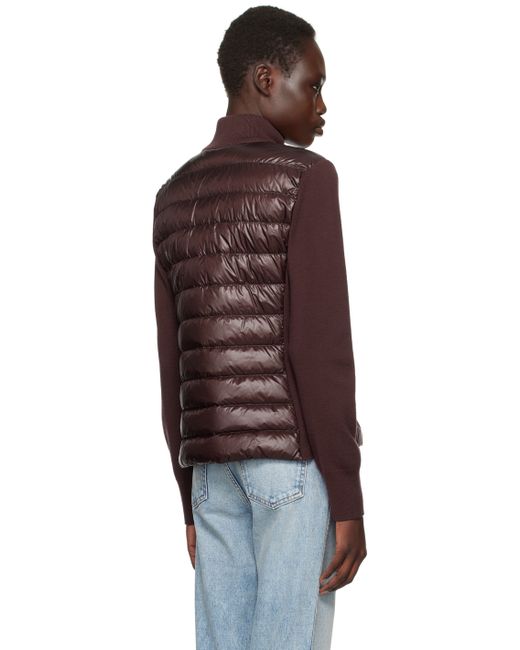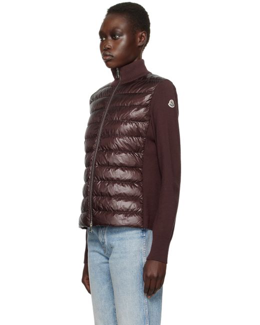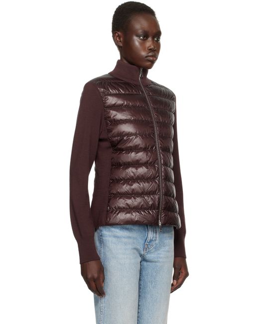 Knit virgin wool and down-filled quilted nylon satin jacket. · DIST-certified down · Paneled construction · Rib knit stand collar and cuffs · Zip closure · Tricolor felted logo patch at sleeve Supplier color: Burgundy Fill 1: 90% goose down, 10% feather.