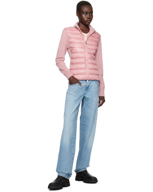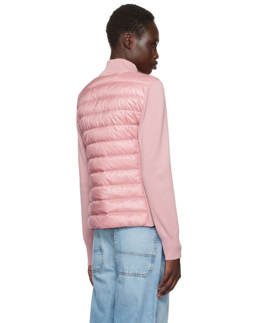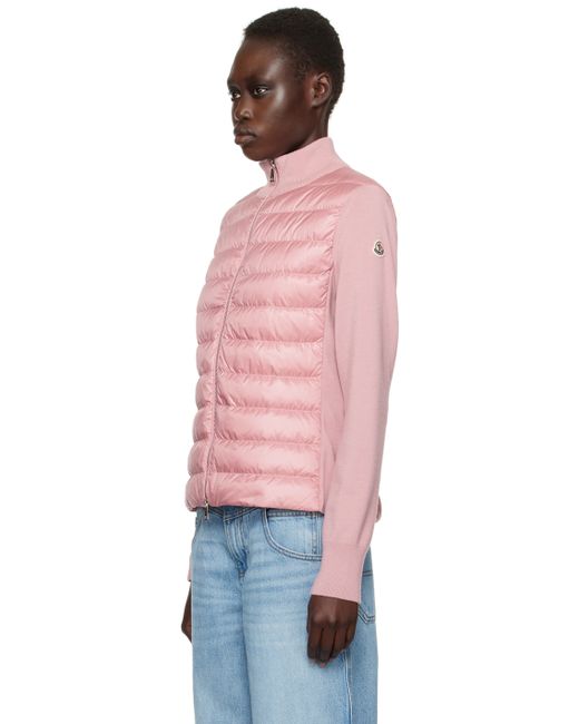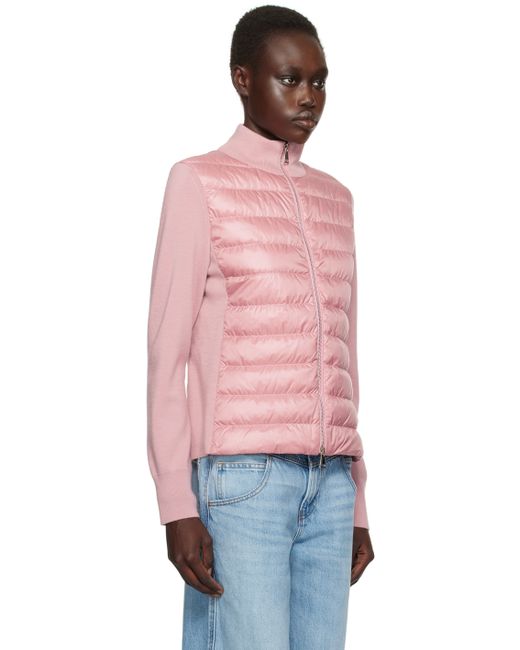 Knit virgin wool and down-filled quilted nylon satin jacket. · DIST-certified down · Paneled construction · Rib knit stand collar and cuffs · Zip closure · Tricolor felted logo patch at sleeve Supplier color: Smooth rose Fill 1: 90% goose down, 10% feather.