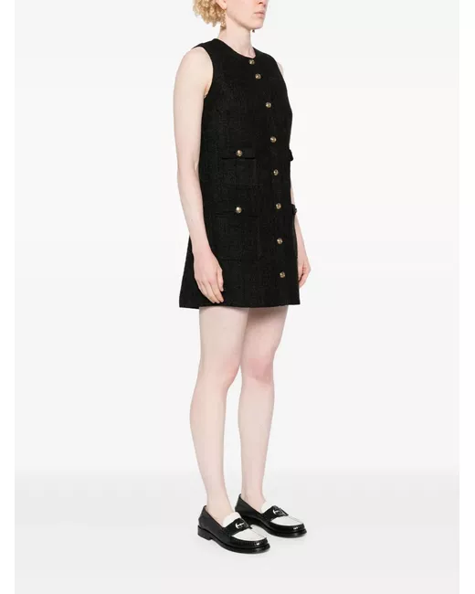 black tweed embossed gold-tone buttons crew neck sleeveless four front patch pockets thigh-length full lining straight hem front button fastening