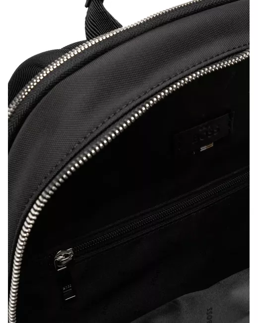 black recycled polyester blend embossed logo to the front all-around zip fastening single flat top handle two padded adjustable shoulder straps front zip-fastening pocket two side stud-fastening pockets internal logo patch internal laptop pocket main compartment