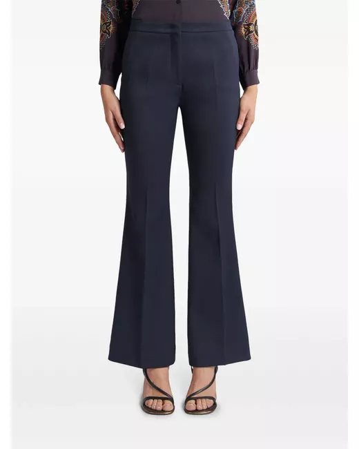 navy blue stretch-design gabardine weave concealed front fastening pressed crease two side slit pockets two rear jetted pockets flared design