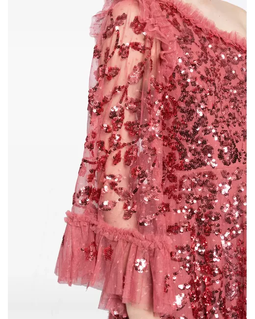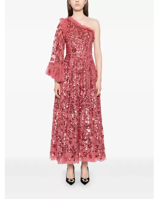 dark red recycled polyester sequin embellishment one-shoulder tulle overlay ruffled detailing concealed rear zip fastening ankle-length