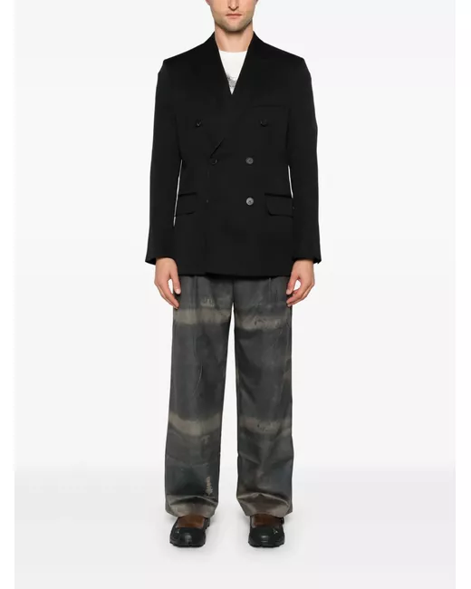 black wool twill weave double-breasted button fastening peak lapels chest welt pocket shoulder pads long sleeves buttoned cuffs two side flap pockets English rear vents internal jetted pocket full lining straight hem