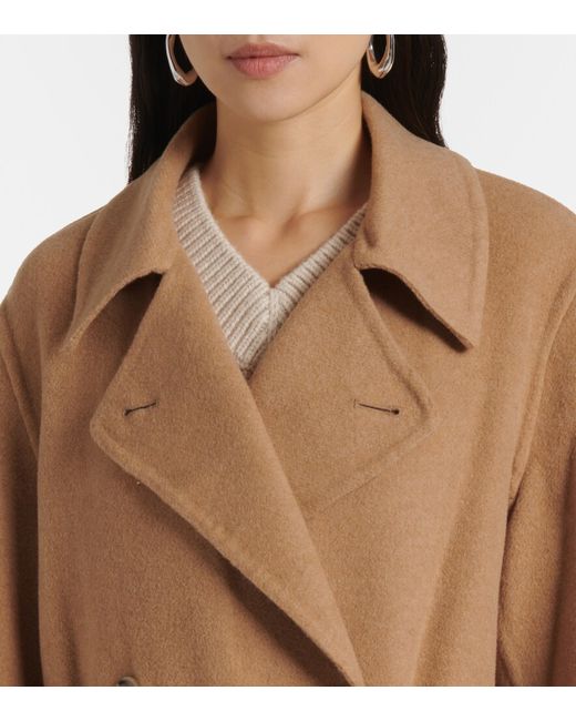 Material: 68% wool, 28% nylon, 4% acrylic. Care instructions: dry clean. Made in China. Designer color name: Camel. Closure: double-breasted (four buttons), belted waist. Pockets: side slit pockets. Lining: 100% polyester. Fully lined. Belt loops.